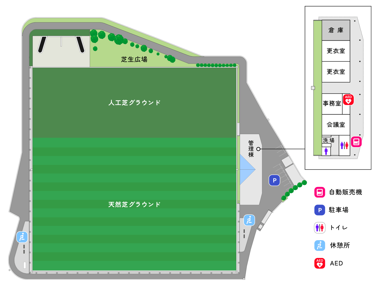 • 夜間照明や放送設備、会議室、更衣室、AEDを備えています。